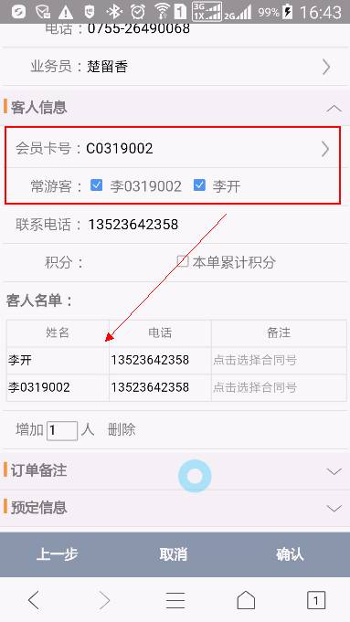 在“客人信息”的標(biāo)簽,可以選擇一個會員卡,當(dāng)選擇了會員卡后,可以從該會員卡的常游客資料中選擇常游客資料并添加到本訂單的客人名單中。另外,當(dāng)選擇了會員卡以后,訂單的客戶也會自動更新為會員卡的所屬客戶。如果本訂單的客戶不是會員卡所屬客戶,請在選擇了會員卡后,再更改訂單的所屬客戶。
