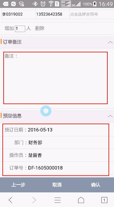 在“訂單備注”標(biāo)簽,輸入訂單的備注信息,在“預(yù)定信息”部分,可以查詢訂單的操作員信息。