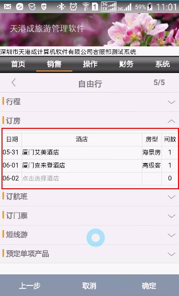 在這里選擇自由行線路中可以供選擇的酒店,并輸入間數(shù)。