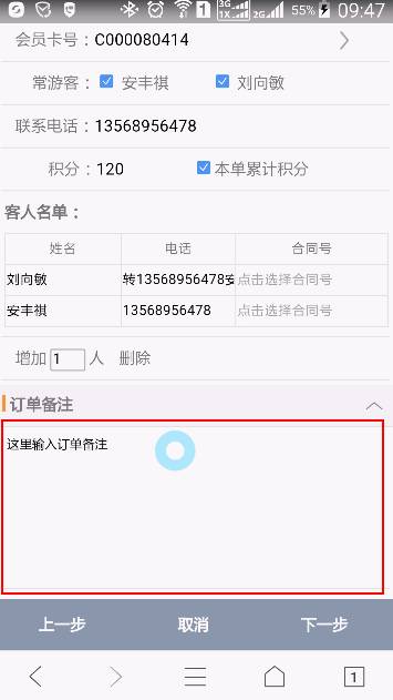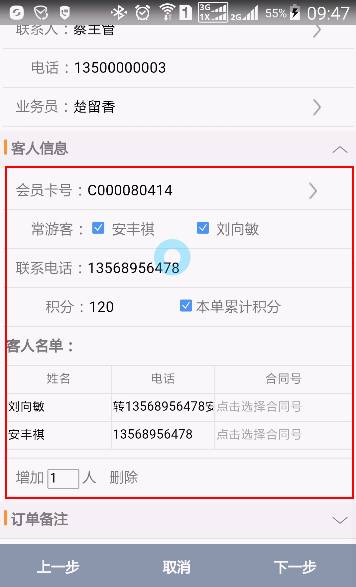 可以為訂單選擇一個(gè)會(huì)員卡號,選擇了會(huì)員卡以后,您可以從會(huì)員卡的常游客資料中勾選游客,并填入本單的客人名單中。您也可以手工添加客人名單。