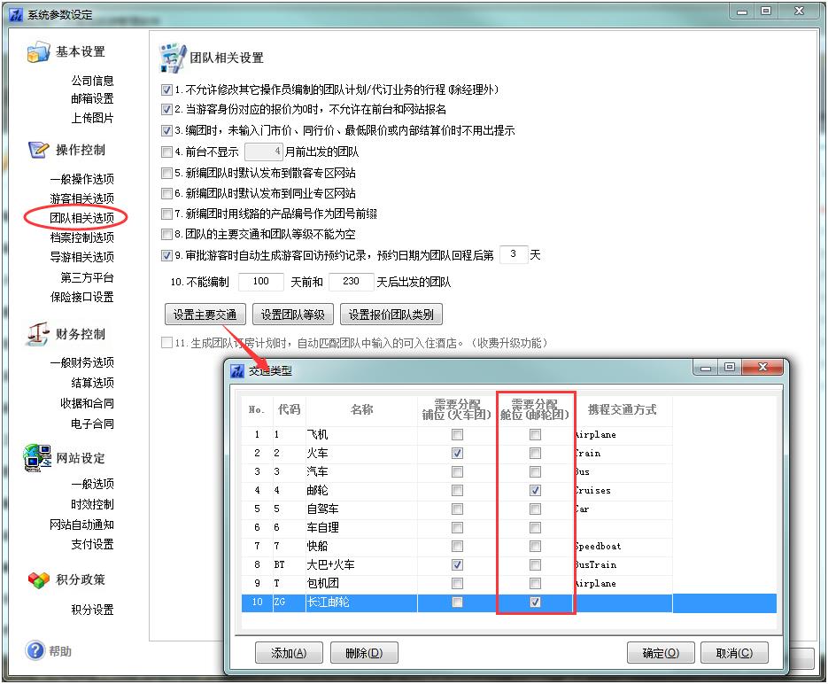 第2步:在系統(tǒng)參數設置中,勾選屬于‘郵輪’的主要交通