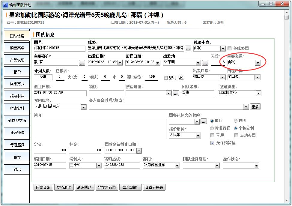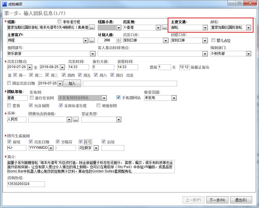 注意:成批編團交通工具選擇和郵輪選擇如下圖(成批編團進入路徑:團隊管理-成批編團)