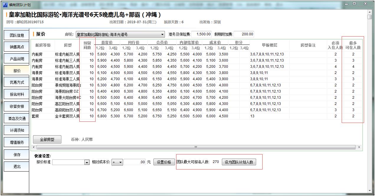 1、預留的艙房預留間數*各個艙房的最多可住人數合計可以計算出團隊最大可報名人數,點擊【設為團隊計劃人數】按鈕,可以將軟件計算出的最大可報名人數設置為團隊的計劃人數。