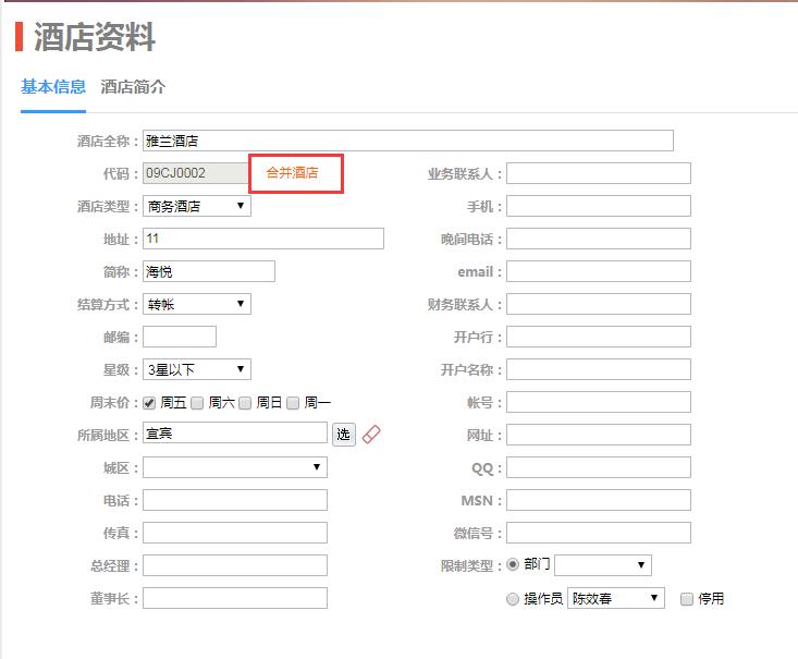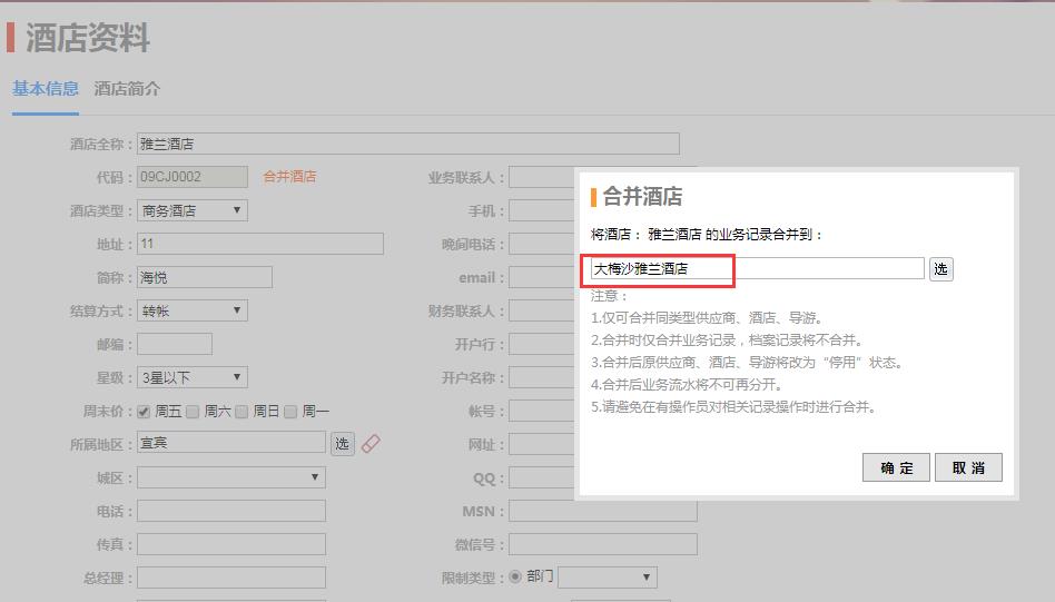 進(jìn)入路徑:檔案-酒店資料及報(bào)價(jià)-選擇酒店-修改-合并酒店