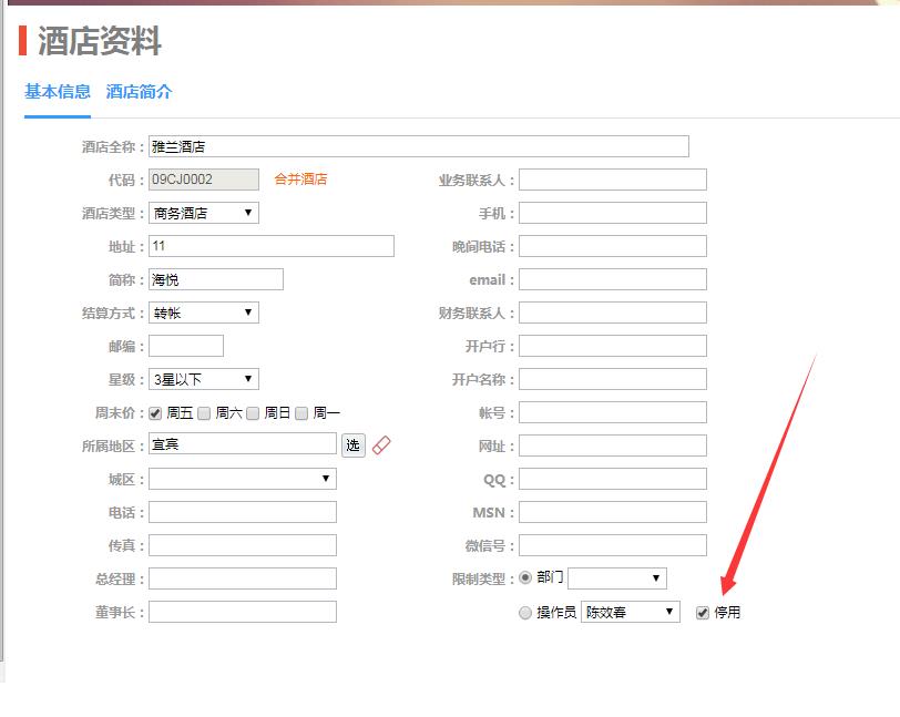 (3)合并成功后“雅蘭酒店”的業(yè)務(wù)記錄會(huì)變成“大梅沙雅蘭酒店”的業(yè)務(wù)記錄,“雅蘭酒店”的檔案會(huì)被變成停用狀態(tài)。