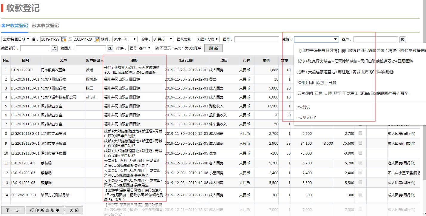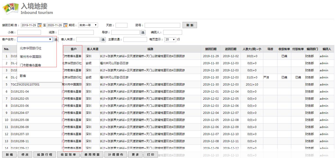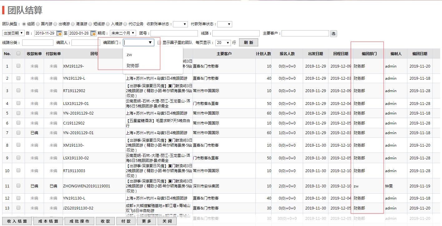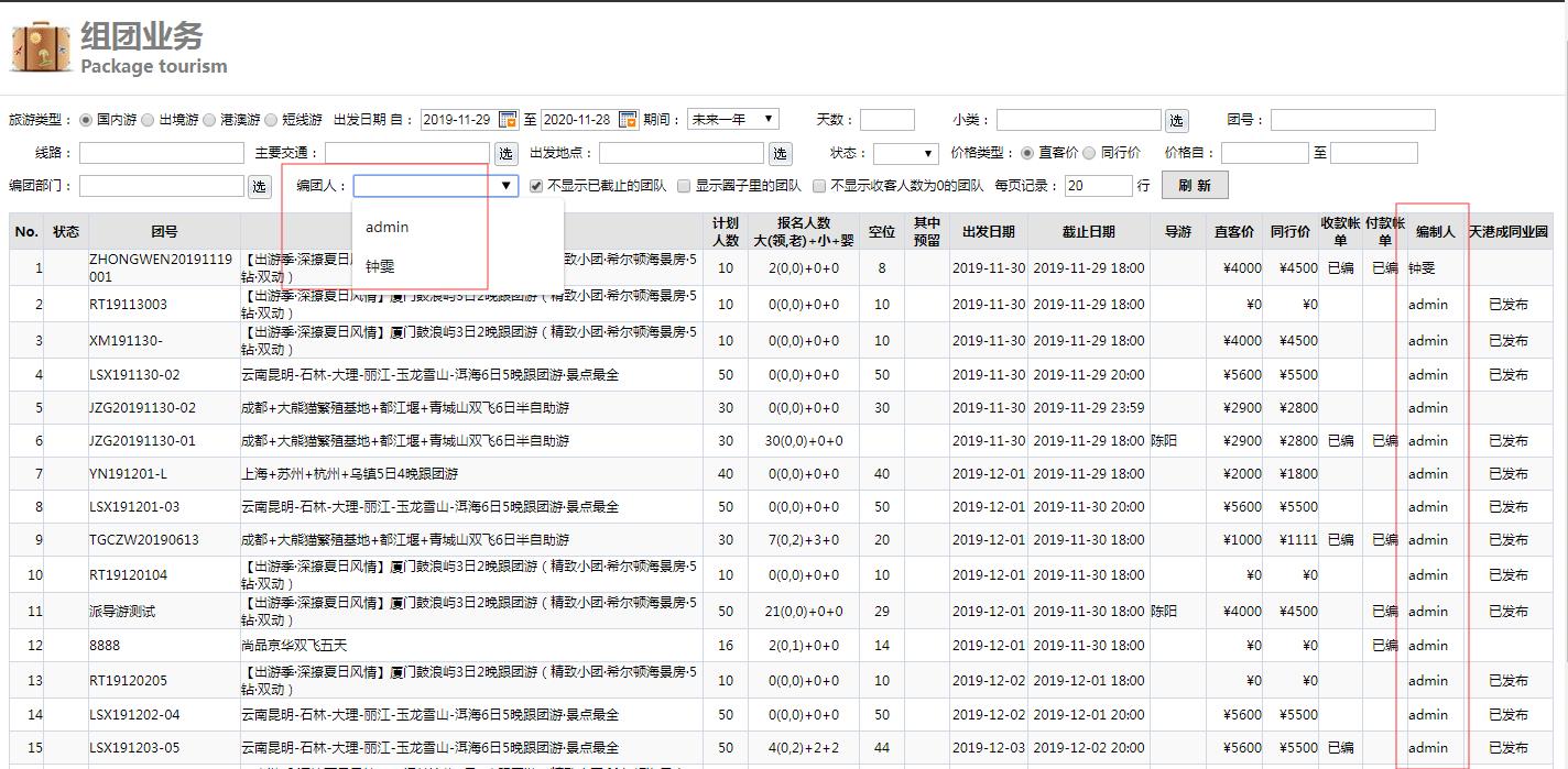 二次篩選功能:檢索條件欄位二次篩選的內(nèi)容會根據(jù)檢索條件的變化而變化。例如:組團(tuán)業(yè)務(wù)按出發(fā)日期期間為一年的檢索條件檢索出來的團(tuán)隊中編團(tuán)人有‘鐘雯’和‘a(chǎn)dmin ‘,那么編團(tuán)人檢索條件的二次篩選的內(nèi)容就是‘鐘雯’和‘a(chǎn)dmin’兩個選擇。