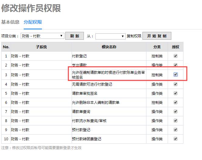 (1)操作員需分配“允許在編制請(qǐng)款單的時(shí)候進(jìn)行付款賬單業(yè)務(wù)審核簽名”。