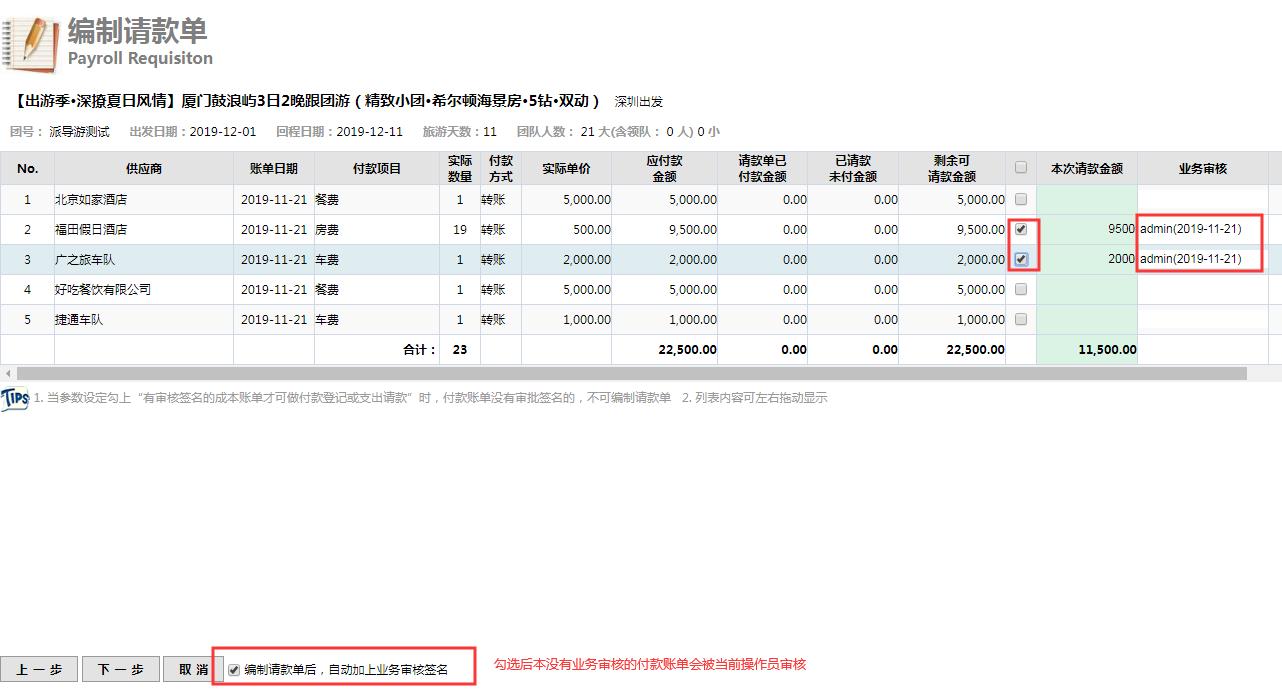 (4)勾選需要請(qǐng)款的付款賬單記錄,點(diǎn)擊【下一步】。