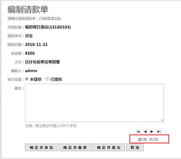 (5)會(huì)根據(jù)不同供應(yīng)商的賬單數(shù)產(chǎn)生請(qǐng)款單數(shù)(例如:選擇兩條不同供應(yīng)商的付款賬單,會(huì)有兩張請(qǐng)款單),您可以點(diǎn)擊右下角的三角形,查看別的請(qǐng)款單信息,信息確認(rèn)無(wú)誤后您可根據(jù)實(shí)際情況選擇下面的按鈕進(jìn)行下一步的操作。
