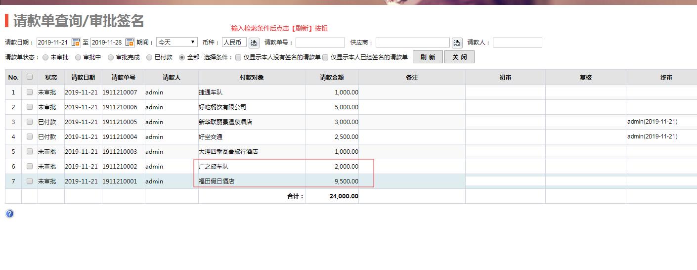 (6)財(cái)務(wù)-付款-請(qǐng)款單查詢/審批簽名可查詢或者審核請(qǐng)款單。