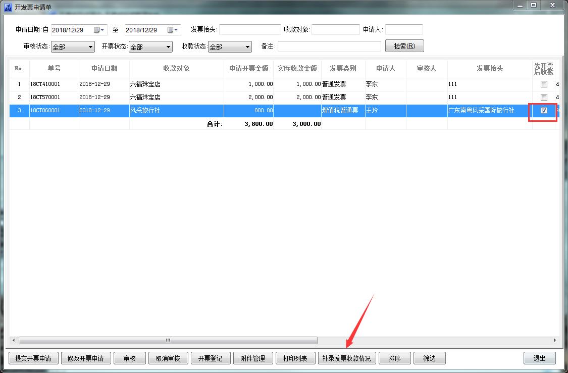 當(dāng)收到開具發(fā)票的款項(xiàng)后,如果收到客戶的款項(xiàng)了,要進(jìn)入發(fā)票管理,選中這張未收款的發(fā)票申請(qǐng)單,點(diǎn)擊【補(bǔ)錄發(fā)票收款情況】按鈕。如下圖所示:
