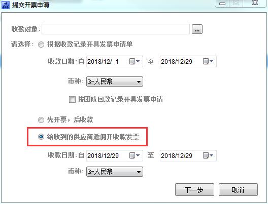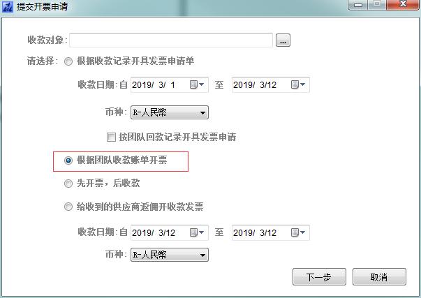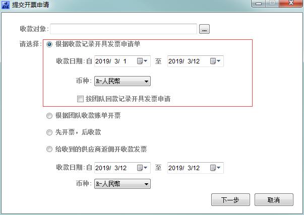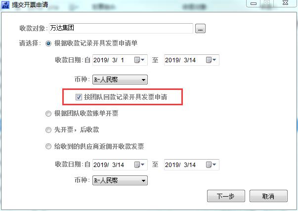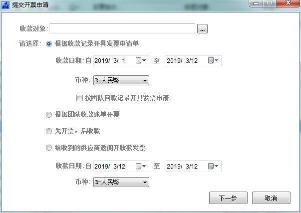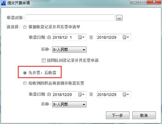 在提交開票申請(qǐng)的時(shí)候,選擇“先開票,后收款”的選項(xiàng),選擇一個(gè)收款對(duì)象(客戶)后,點(diǎn)擊【下一步】按鈕。