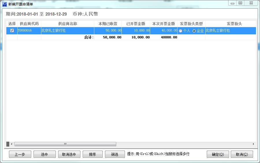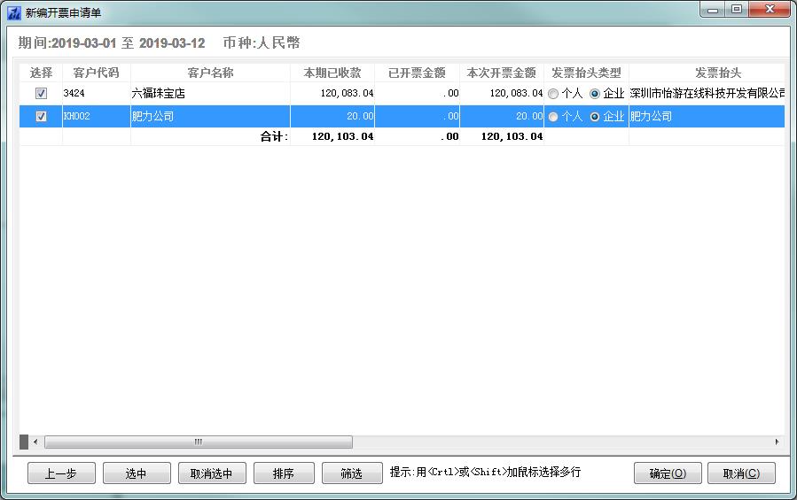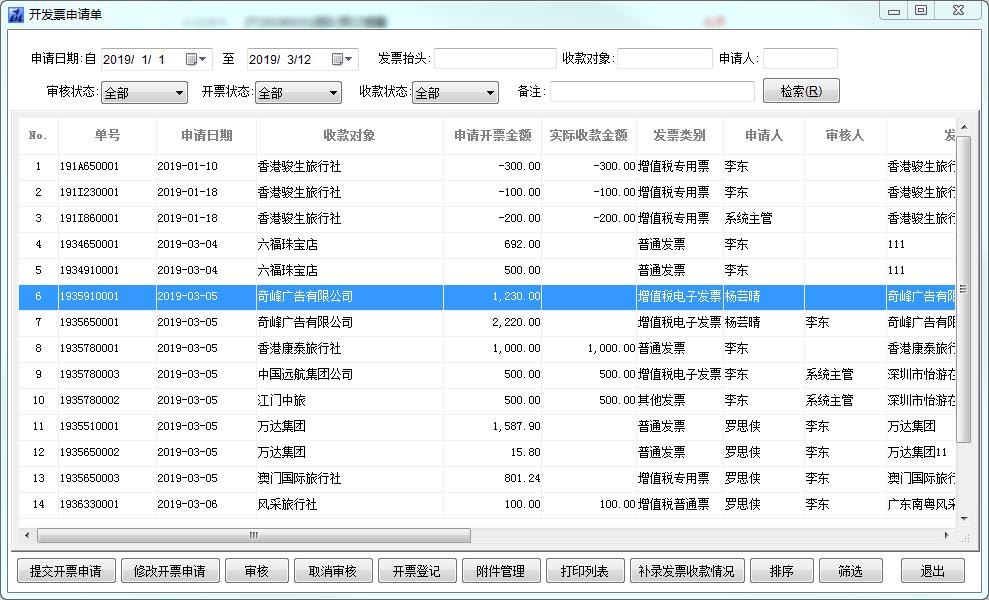 輸入查詢條件后,可以檢索出已經(jīng)開出的開票申請(qǐng)單。