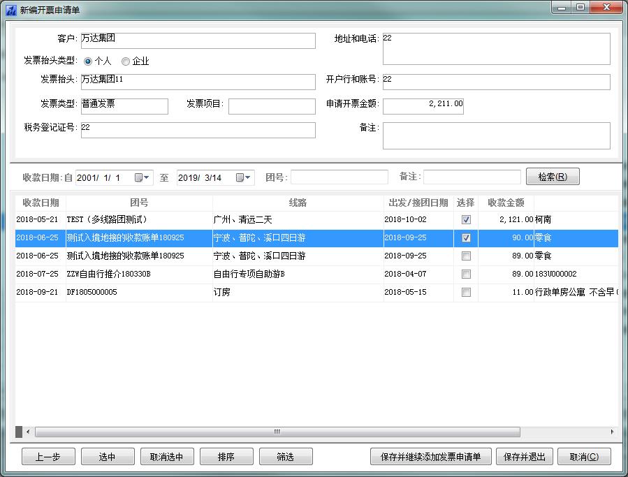 點(diǎn)擊【保存并繼續(xù)添加發(fā)票申請(qǐng)單】按鈕,可以將勾選的金額開具到一張發(fā)票申請(qǐng)單里面,保存后,可以勾選別的記錄(別的游客)的收款記錄,再提交別的開票申請(qǐng)單。