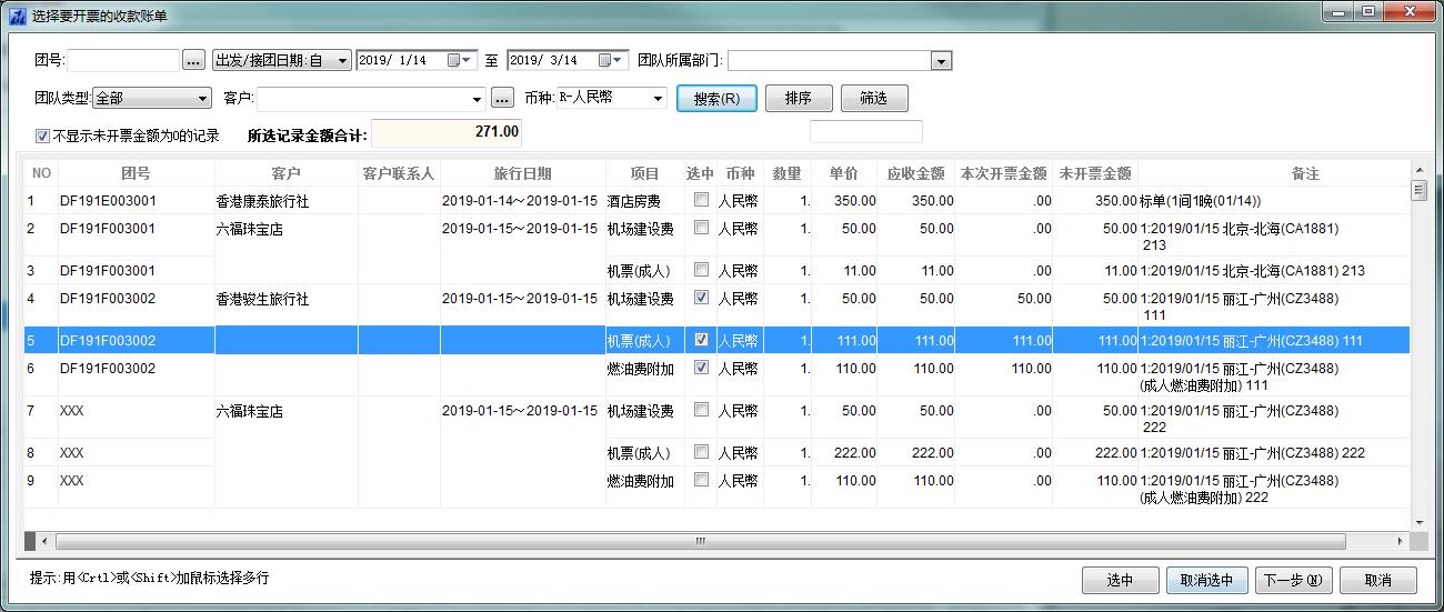 如果勾選了“按團(tuán)隊(duì)回款記錄開具發(fā)票”則是按照?qǐng)F(tuán)隊(duì)回款記錄勾選來(lái)進(jìn)行開票操作。如下圖所示。這種情況通常用于那些按散客收款登記的客人的發(fā)票開具。您需要先選中一個(gè)客戶,然后點(diǎn)擊【下一步】按鈕