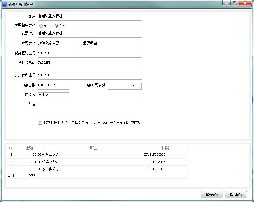 當(dāng)選擇了多個(gè)不同的客戶開具發(fā)票后,輸入開票類型和稅務(wù)登記號(hào)等信息,點(diǎn)擊【確定】后完成開票申請(qǐng)。