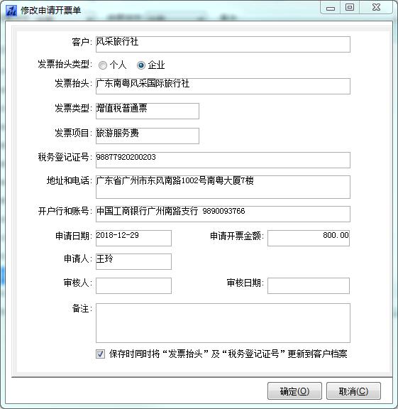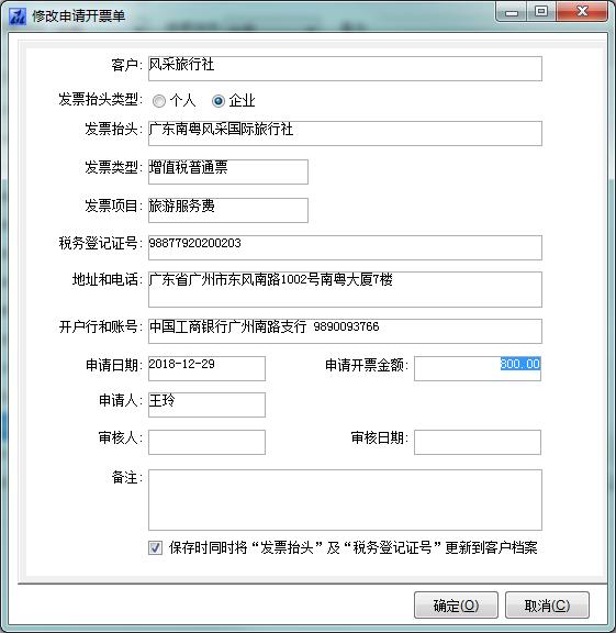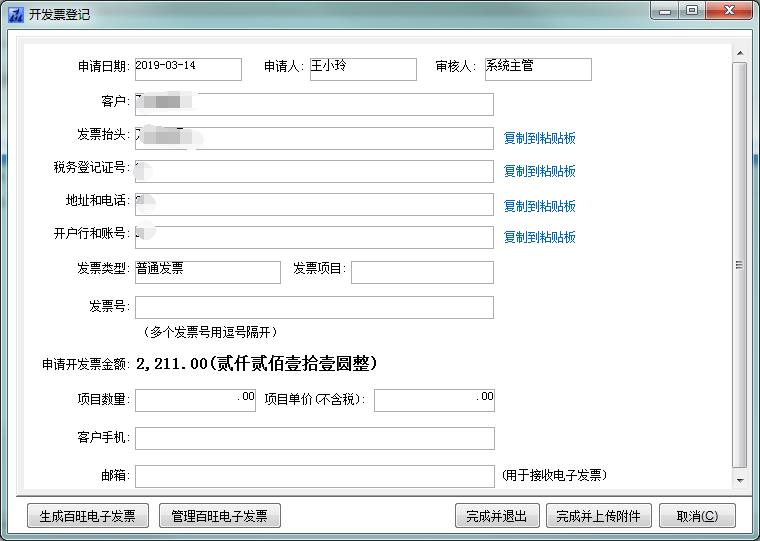 (1)在新編開票申請(qǐng)單界面“剩余可開票”金額、發(fā)票抬頭、發(fā)票類型、稅務(wù)登記證號(hào)、地址和電話等信息是可修改的。但是修改開票申請(qǐng)中,客戶以及申請(qǐng)開票金額是不可以修改的。